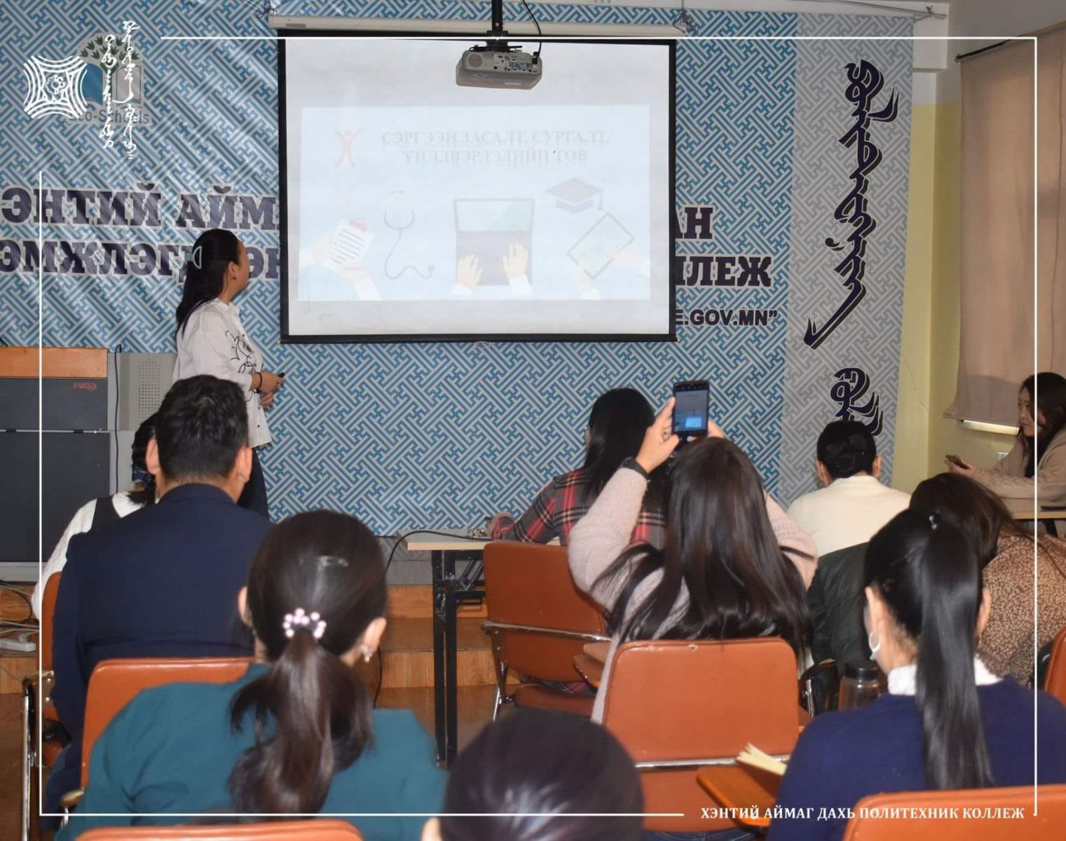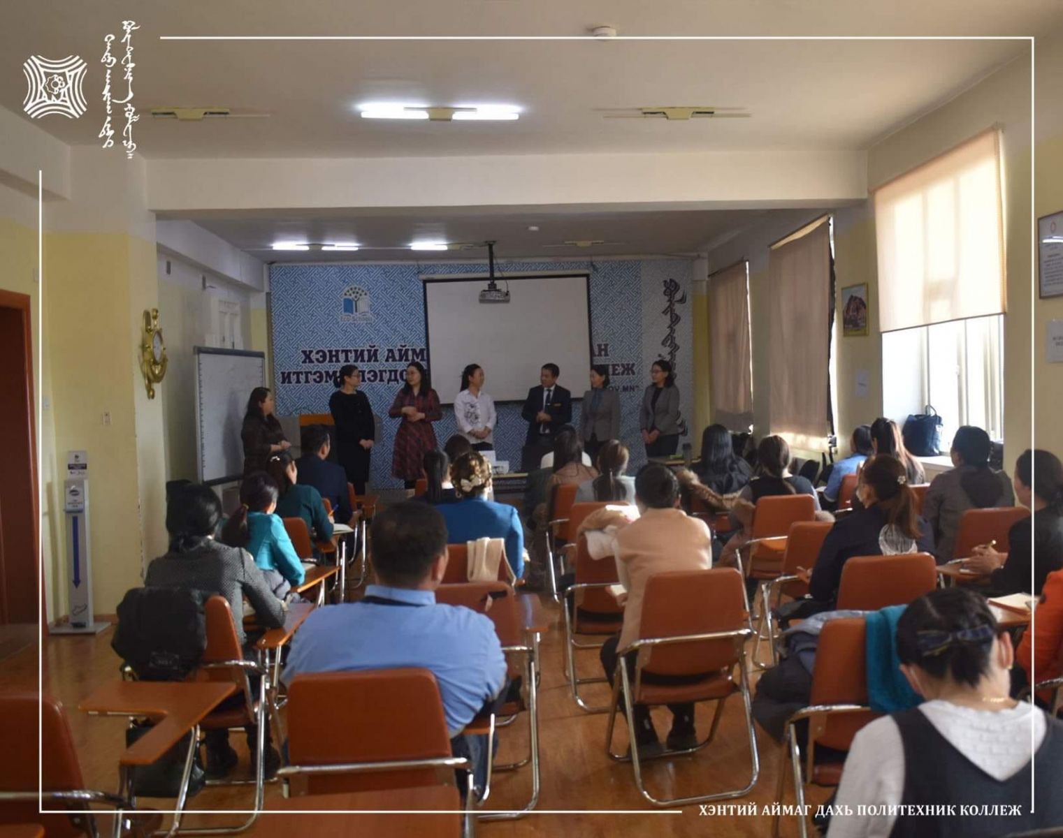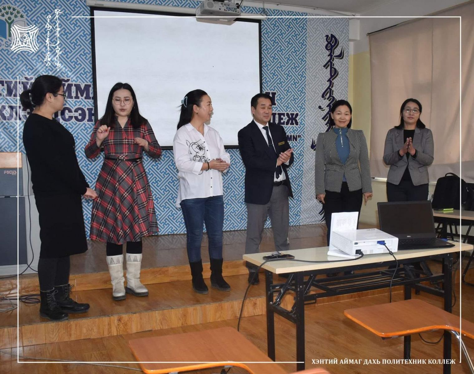 Хэнтий аймаг дахь Магадлан итгэмжлэгдсэн Политехник коллежид 2022 оны 12 дугаар сарын 8,9-ны өдрүүдэд Хэнтий аймагт зохион байгуулагдах “Хөгжлийн бэрхшээлтэй иргэдтэй ажиллах арга зүй” сургалтын удирдамжийн дагуу мэргэжлийн боловсрол, сургалтын байгууллагууд хөгжлийн бэрхшээлтэй иргэдэд мэргэжлийн боловсролд хамрагдах бололцоог олгох хэрэгцээ шаардлагатай байгаа учир энэ чиглэлээр хэрэгжүүлэх ажлын хүрээнд Сэргээн засалт, Сургалт, Үйлдвэрлэлийн төвийн Мэргэжлийн боловсрол, Ур чадвар олгох Сургууль, “Хөгжлийн бэрхшээлтэй иргэнтэй ажиллах арга зүй” сэдвийн хүрээнд хөгжлийн бэрхшээлтэй иргэнтэй ажилладаг багш, ажилтан, албан хаагчдад арга зүйн зөвлөгөө мэдээлэл өгч, мөн дохионы хэлний анхан шатны сургалтыг зохион байгуулж ажиллалаа.