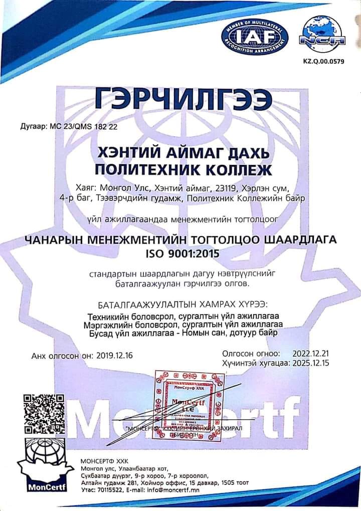 ОЛОН УЛСЫН ISO 9001 2015 СТАНДАРТАА 2 ДАХЬ УДААГАА ДАВТАН БАТАЛГААЖУУЛЛАА