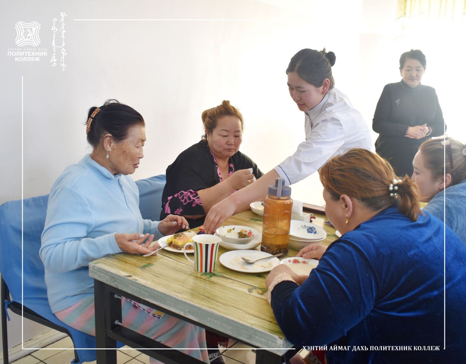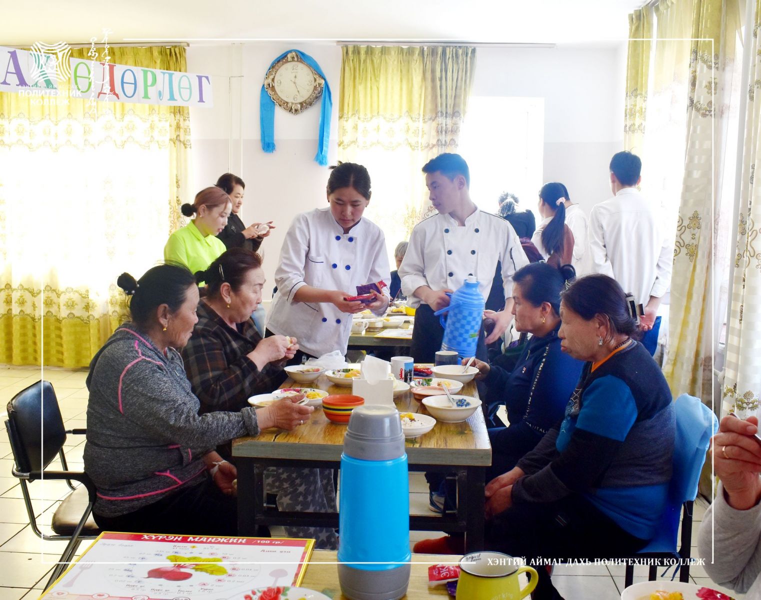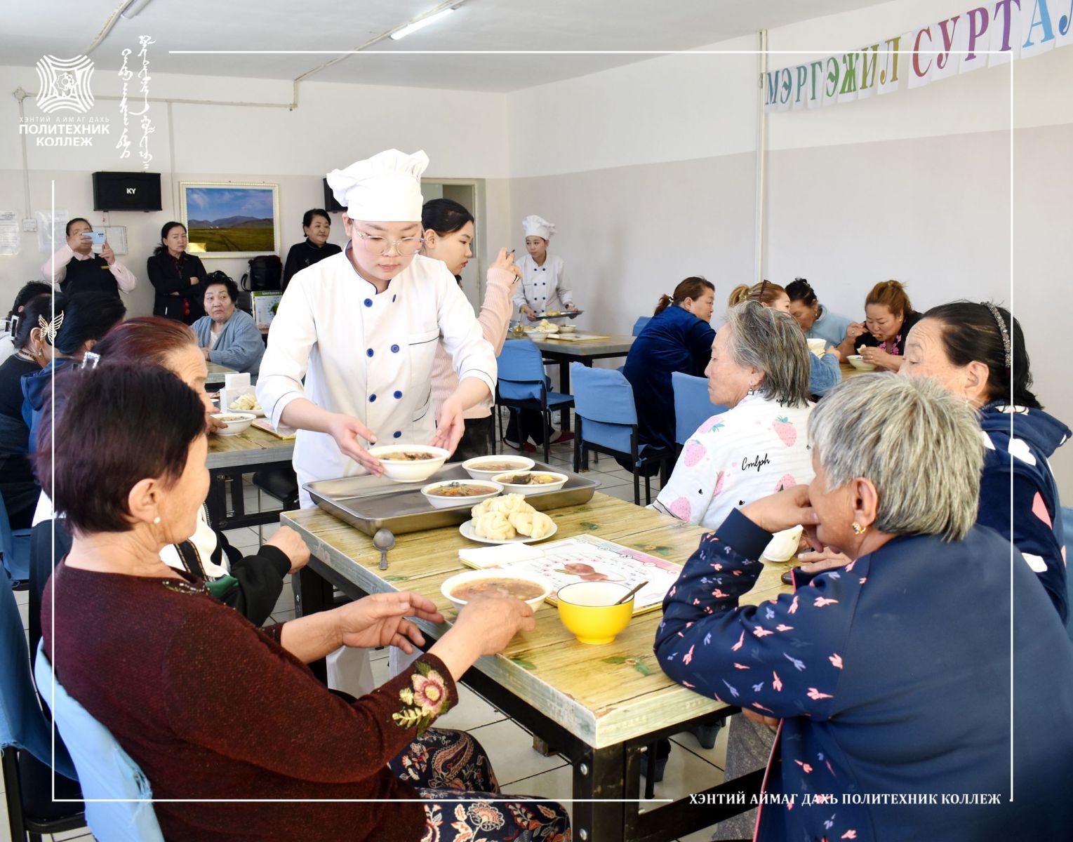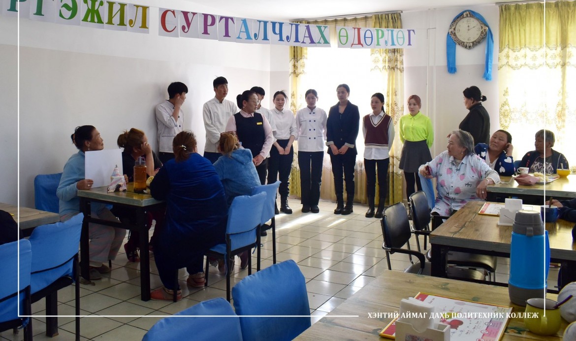 Хэнтий аймаг дахь Магадлан итгэмжлэгдсэн Политехник коллежийн мэргэжил сурталчлах өдөрлөгийн хүрээнд хоол үйлдвэрлэл үйлчилгээний техник технологчийн ангийн сурагчид Хэнтий аймгийн хөдөлмөр халамж үйлчилгээний хэлтсийн дэргэдэх Ахмадын сувилалд эмчлэн сувилуулж байгаа ахмадууддаа өдрийн хоол цайг нь хийж өгөхийн зэрэгцээ хоолонд орсон хүнсний материалын шимт бодис, илчлэг чанарын талаар мөн сурч байгаа мэргэжлийнхээ товч танилцуулгыг хийлээ.
